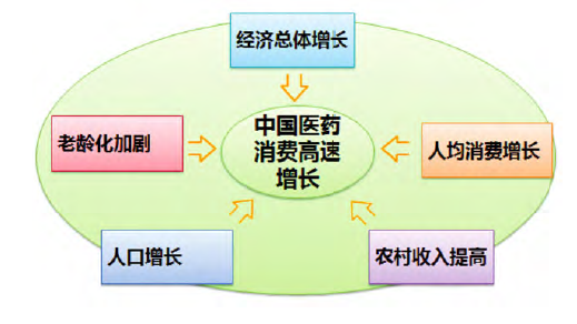 我国医药的消费正处在一个高速增长的阶段,人口增长、老龄化加剧、经济总体增长、人消费增长、农村收入提高,这五大因素是医药市场蓬勃发展的动力。在这五大因素的驱动下,我国的医药市场需求将会在未来相当长的时间内保持高速增长: