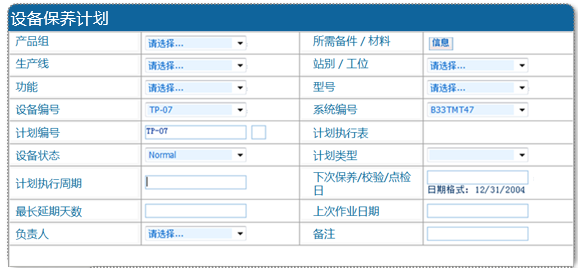 (2)一台设备可以有一或多个保养计划。每个计划有自己的执行周期,如日、周、月、季度、年度等。