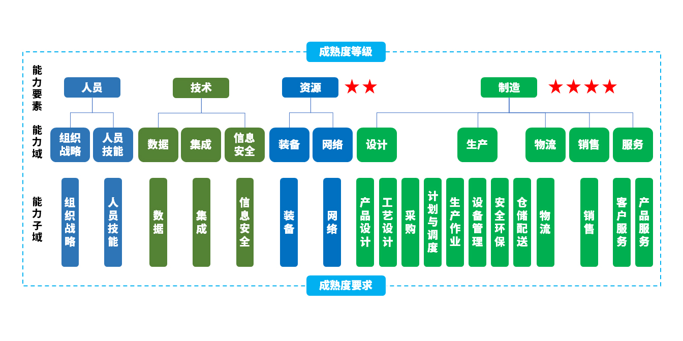制造—能力域,详细能力范围涉及:设计、生产、物流、销售、服务等5个能力子域,他们又分别有不同的能力子域关键点,需要结合用户实际行业、领域及现状进行相关结合评估。