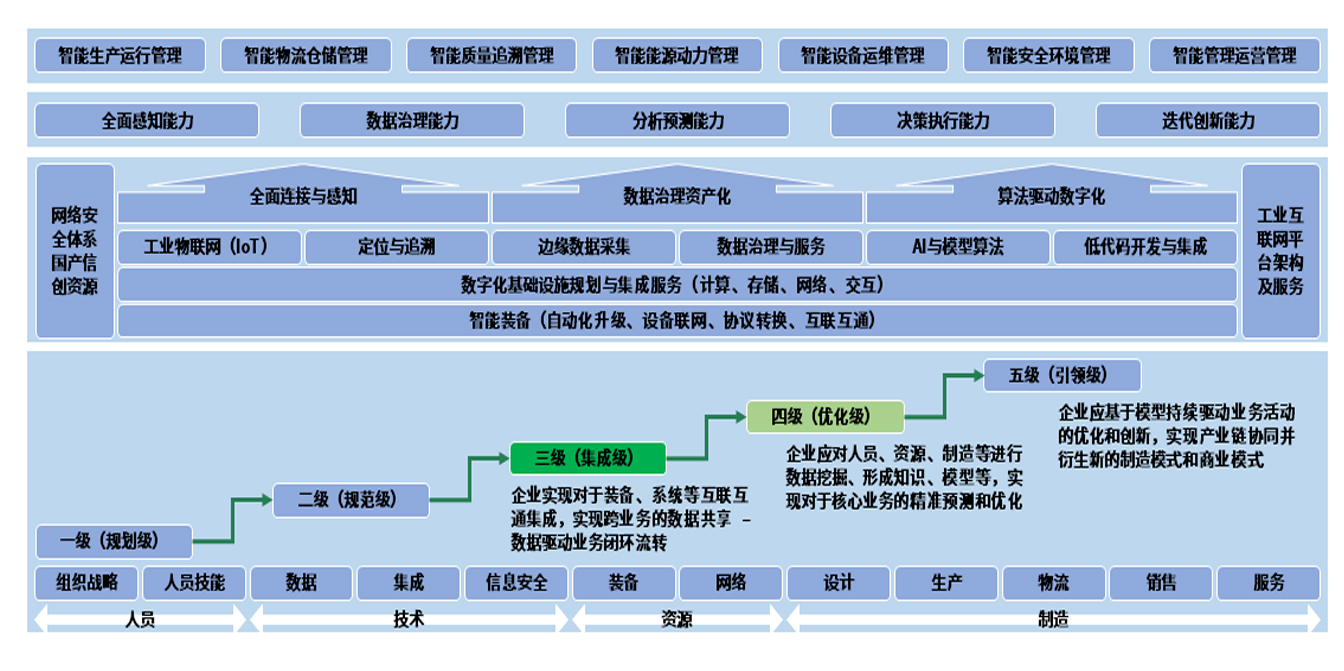 四级 – 优化级:企业应对人员、资源、制造等进行数据挖掘,形成知识、模型等,实现对核心业务活动的精准预测和优化。