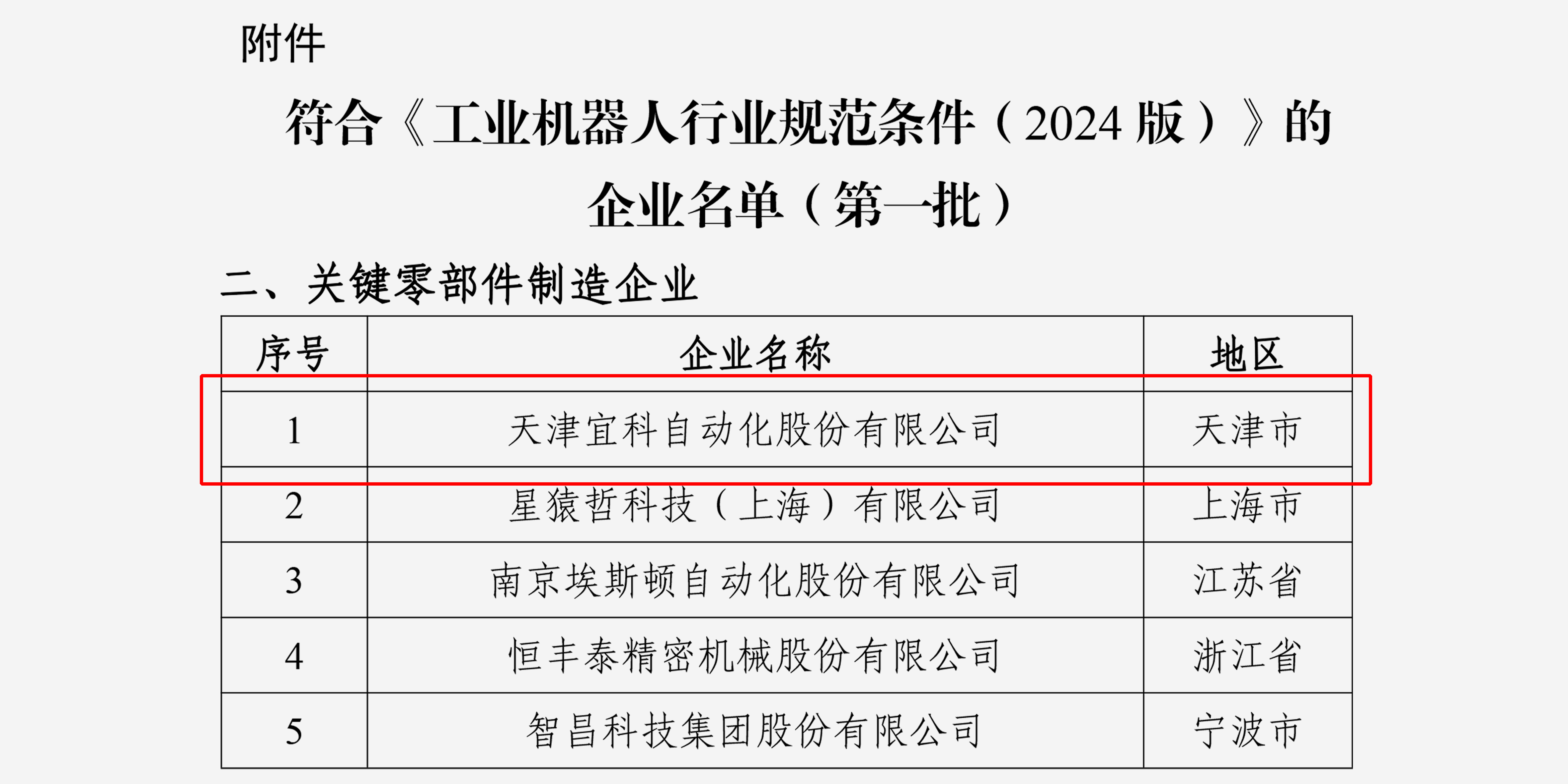 近日,为进一步加强工业机器人行业规范管理,推动产业高质量发展,工信部根据《工业机器人行业规范条件(2024版)》及《工业机器人行业规范条件管理实施办法(2024版)》(工业和信息化部公告2024年第20号)相关要求,正式发布了第一批符合《工业机器人行业规范条件(2024版)》的企业名单。天津宜科自动化股份有限公司(以下简称宜科)凭借在机器人行业关键零部件制造领域的深厚技术能力与积极创新精神,荣耀入选。