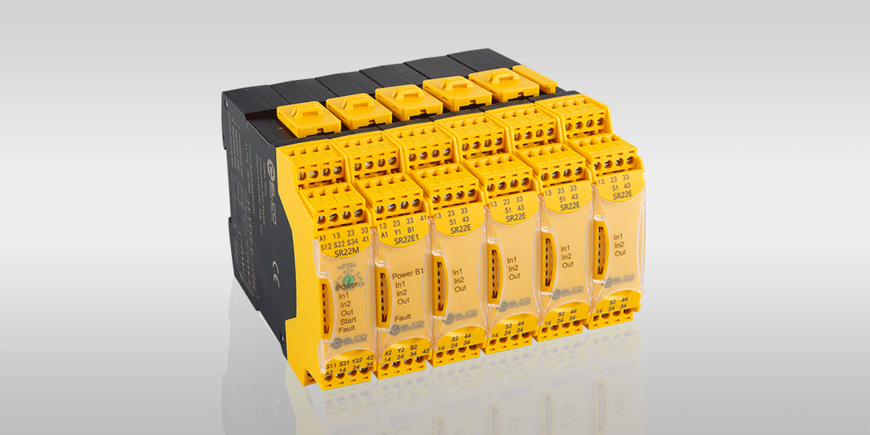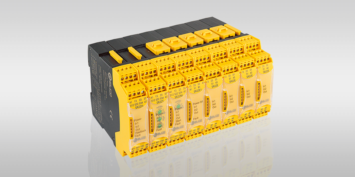 全新SR22系列级联安全继电器符合国际安全认证标准Cat.4,PLe(ISO13849-1),SIL3(IEC 61508) (EN 60947)。采用紧凑型设计宽度22.5mm,满足高密度安装需求,可插拔式端子确保配线检查便利。