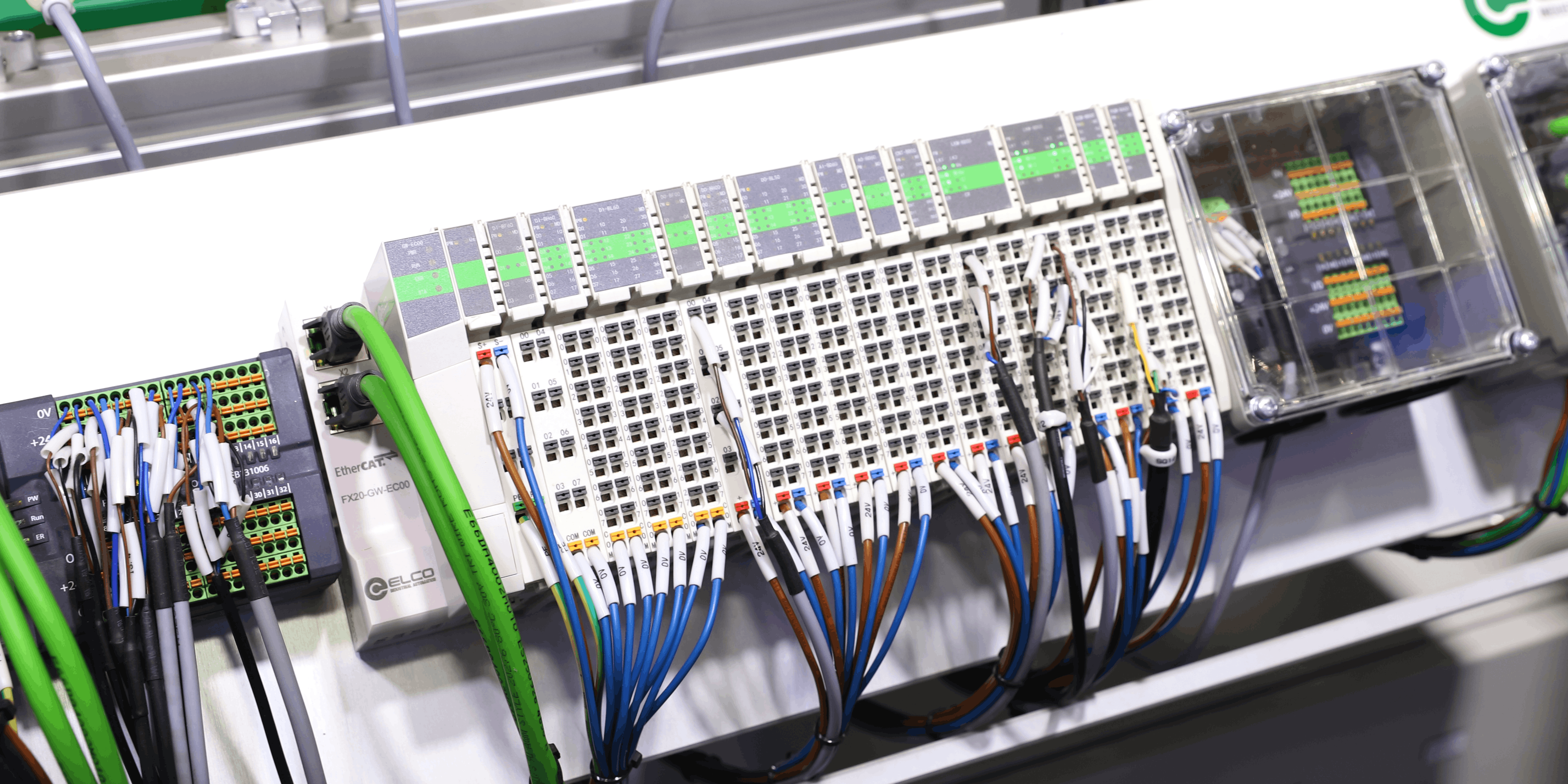 在物流输送线中,FX20插片式I/O系统发挥着货物位置信号采集、距离测量数据反馈、串口设备及部分IO-Link从站设备数据传输的神经传输枢纽的作用。